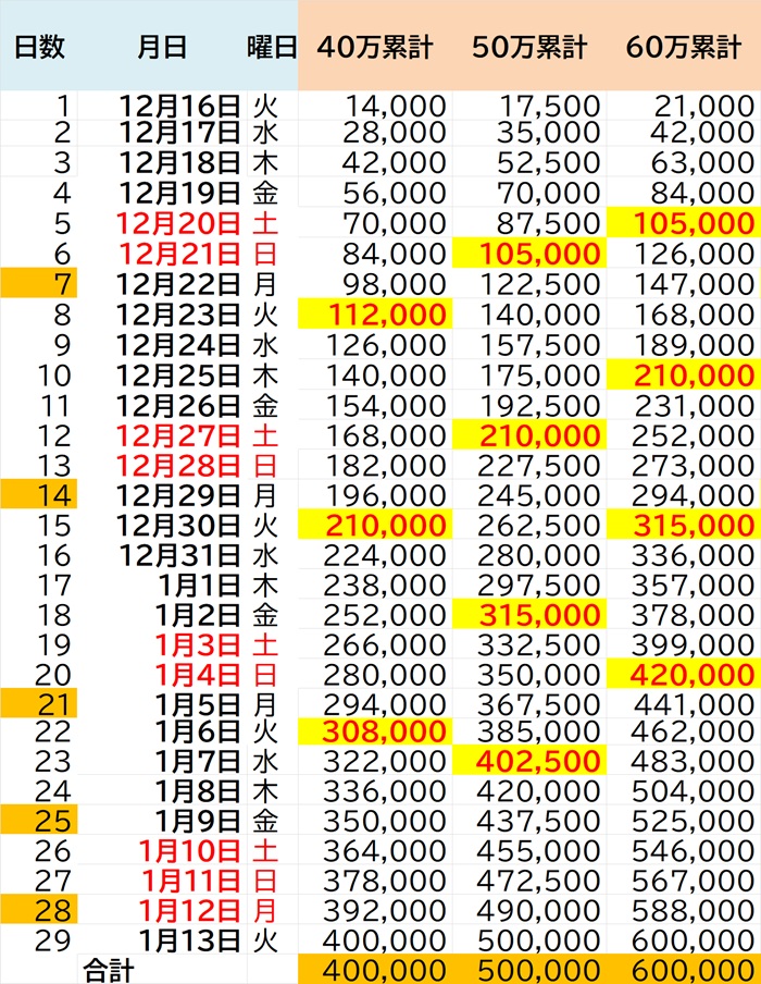 なお、20万と30万、40万用のスケジュールでは年内に10万玉を回収することができます。